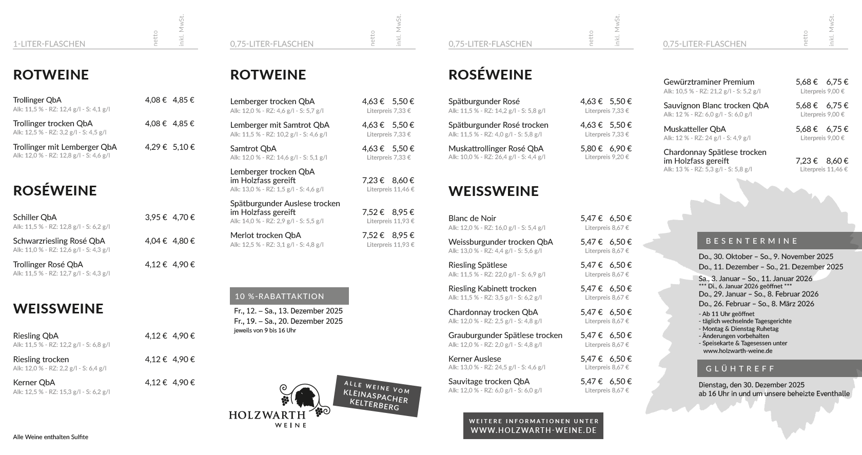 Das Angebot umfasst inzwischen über 40 verschiedene Weine, Sekte, Weinschorlen sowie saisonale Getränke wie Glühwein und Traubensaftschorle.